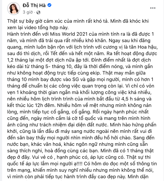 Sáng ngày 17/12, đại diện Việt Nam đã viết tâm thư gây xúc động kể về hành trình chinh chiến 1 tháng vừa qua. Ở tuổi đôi mươi, Đỗ Hà đã phải chịu nhiều áp lực, mệt mỏi khi gánh vác sứ mệnh đại diện Việt Nam tại đấu trường nhan sắc đẳng cấp quốc tế. Nàng hậu cho biết 1 năm sau khi đăng quang cô gặp rất nhiều khó khăn do dịch bệnh, không có nhiều thời gian tập luyện cùng ekip như những đàn chị khác.