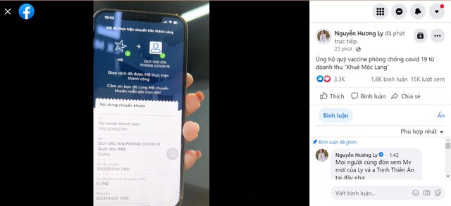Tối ngày 30/12/2021, ca sĩ Hương Ly đã phát livestream trên trang fanpage của mình để công bố doanh thu từ MV Khuê Mộc Lang là 103.579.000đ. Ngay trong livestream, Hương Ly đã trực tiếp thực hiện phần chuyển khoản đến số tài khoản công khai của Quỹ vaccine Covid-19.