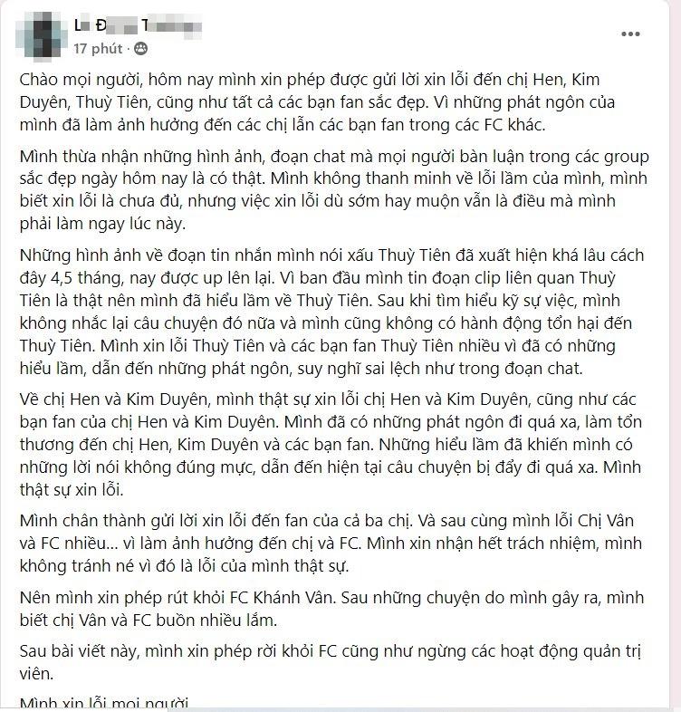 Trước sự chỉ trích của cộng đồng fans sắc đẹp, L.Đ.T đã có lời xin lỗi. Thừa nhận sai lầm, người này đồng thời tuyên bố rút khỏi FC Khánh Vân.