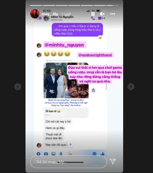Trước sự việc, Phương Ly đã nhắn tin cho Minh Tú phân trần: “Hôm qua chị trêu ông ấy vì đang đi uống rượu cùng mọi người. Trêu thôi chứ không có ý gì đâu nha”.