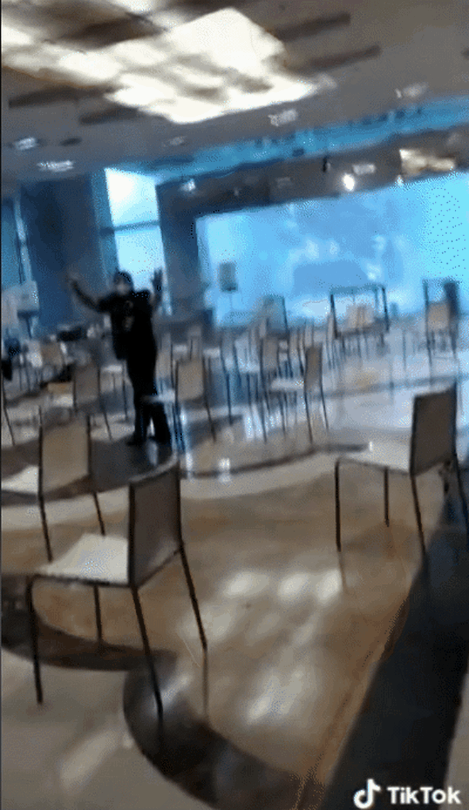 Trong video, có thể thấy một phần trần nhà trung tâm thương mại bị nứt ra và những mảng bê tông cứ thế rơi xuống như vũ bão. Chứng kiến cảnh này, cô gái cầm điện thoại không quên bật camera ghi lại khoảnh khắc kinh hoàng trong khi miệng thì la hét thất thanh, chân không quên bỏ chạy khỏi hiện trường.